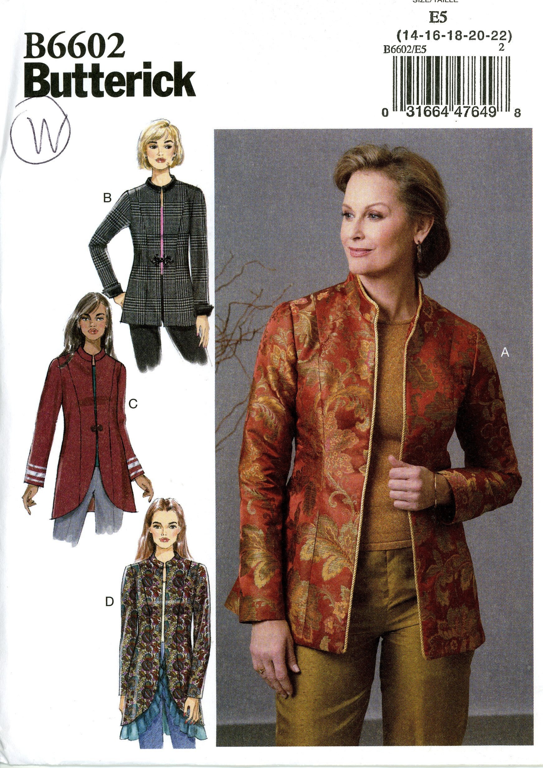 Asian Style Pattern Mandarin Collar Long Jacket Blazer Short Jacket Frog Enclosure Tapered Ankle Length Pants Butterick B4937 Uncut Butterick Sewing Pattern Retro Sewing Patterns Jacket Pattern